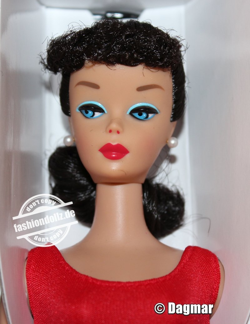 EThe first Barbie – Number 1 – had a Ponytail and a curly Pony. Mattel produced six Barbies (Numer 1-6) of this type. Number 1-4 were available with blonde and brunette hairs, Number 5-6 even with red hairs. So alltogether Mattel produced 14 different Ponytail Barbies between 1959 and 1962. To distinguish number 1-6 can be difficult, as their hair(style) and facepainting is nearly identical. They differs in the hair material and in their Bodys (Bodymark). 1972 the Ponytail Barbie had a little revival with the Montgomery Ward’s Barbie, an early reproduction of the Ponytail Barbie. The doll was an exclusive production for the 100th birthday of Montgomery Ward. Since Barbies 35th Anniversary Mattel presents regulary Ponytail reproductions. DDie erste Barbie – Nummer 1 – hatte einen Pferdeschwanz und einen gelockten Pony. Von diesem Typ wurden sechs Barbies (Nummer 1  bis 6) produziert. Nummer 1-4 gab es jeweils in einer blonen und brunetten Version, Nummer 5-6 zusätzlich auch in rothaarig. Insgesamt wurden somit 14 verschiedene Ponytail Barbies produziert. Anhand der Gesichtsbemalung und Frisur sind Nummer 1 bis 6 nur schwer zu unterscheiden. Eine wirklich eindeutige Identifizierung ist teilweise nur in Kombination mit ihrem (original) Körper bzw. der Körpermarkierung möglich. 1972 gab es noch mal eine Special Edition der Ponytail Barbie. Die Montgomery Ward Barbie wurde exklusiv für das amerikanische Versandhandelsunternehmen produziert. Und seit Barbies 35sten Geburtstag produziert Mattel regelmäßig Repro Barbies mit Ponytail.